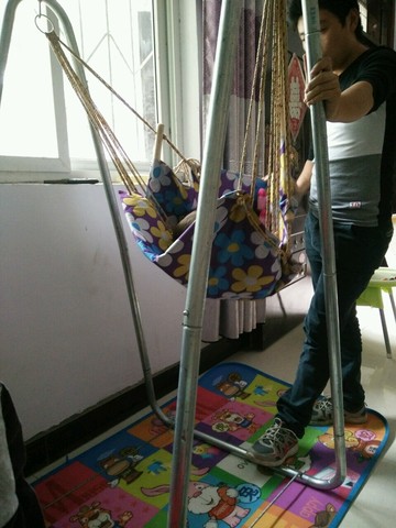 一张一张来!第一张:玥爸给小玥的半岁礼物是一个吊床,用厚厚的钢筋做成的架子,上面有固定,小玥躺在软软的兜兜里,有玥爸陪伴着,晃晃悠悠,小玥躺着里面开心的不得了,笑声特大!