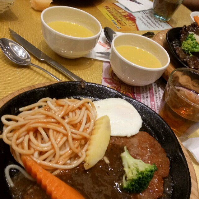 浓汤配意大利面,牛肉补充一天的能量,配少量西蓝花和胡萝卜,健康的一天从早餐开始