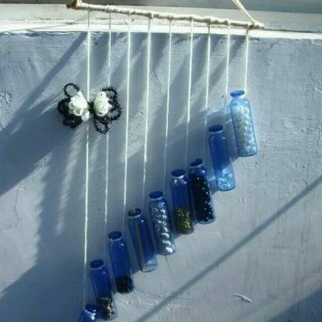 小蓝瓶还可以每个插一枝花,九个用五颜六色的毛线捆绑起来,也是很漂亮的哦!
